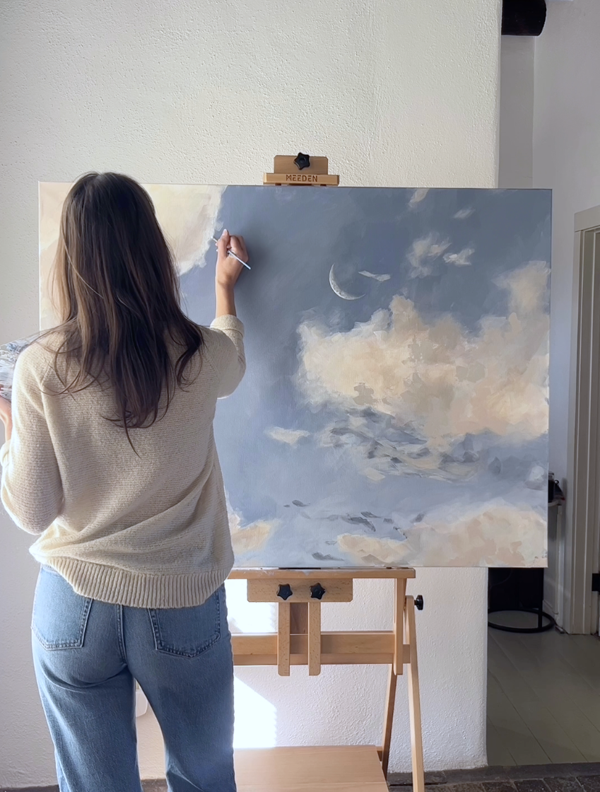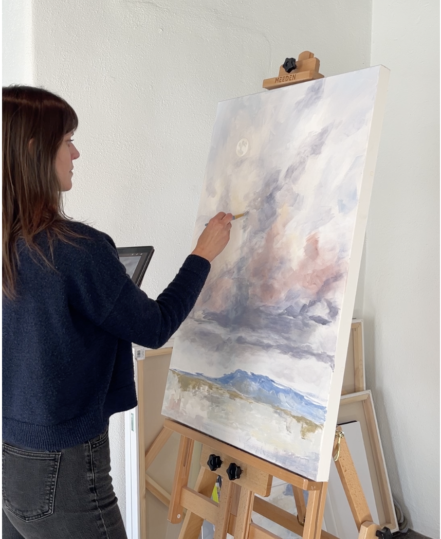 She then prepares a large canvas in advance, blocking in basic forms so that guests arrive to an artwork already in motion.